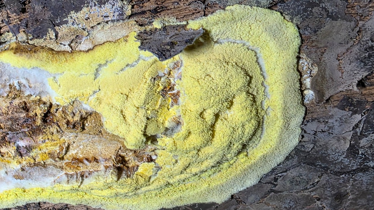 La couche jaune poudreuse visible en surface correspond aux conidies (spores asexuées) d’Hypomyces chrysospermus, qui a littéralement enveloppé le sporophore de Meruliporia pulverulenta. Sous ce voile, on peut encore distinguer l’aspect méruloïde caractéristique de l’hôte : un relief plissé, un réseau sinueux typique des champignons corticioïdes.